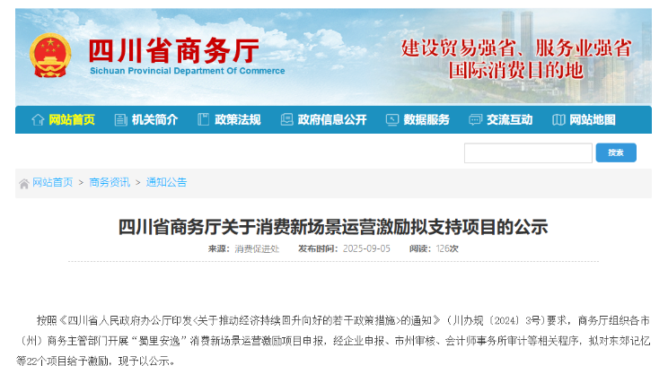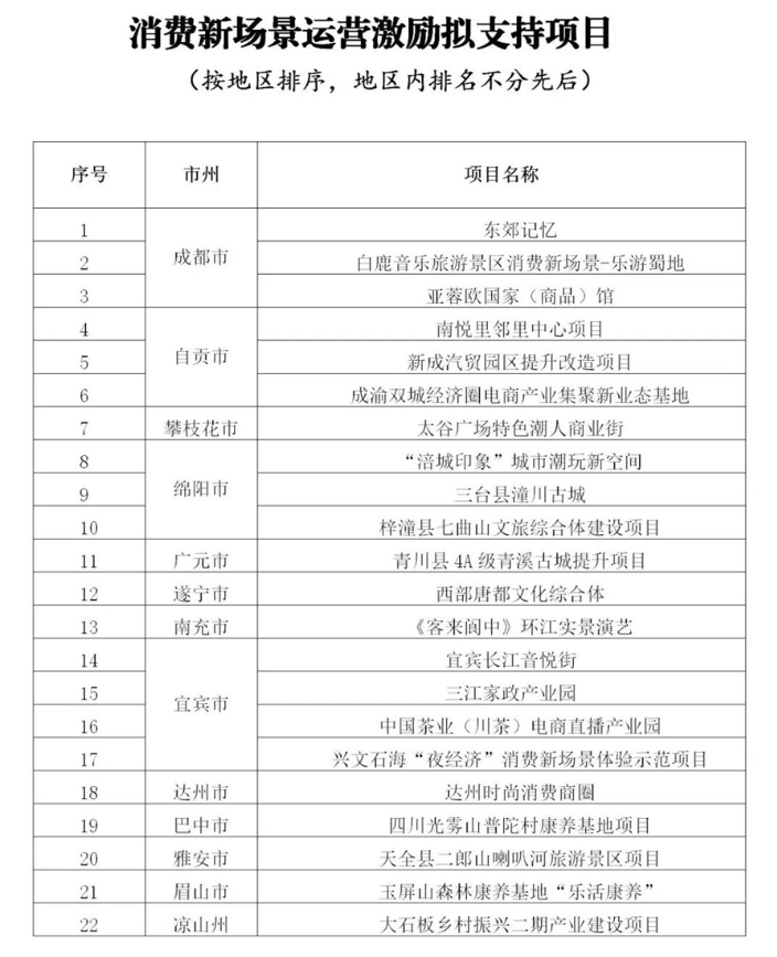 按照《四川省东说念主民政府办公厅印发<对于鼓吹经济抓续回升向好的几许战略次序>的见知》(川办规〔2024〕3号)条目,商务厅组织各市(州)商务主宰部门开展“蜀里怡悦”消耗新场景运营激发相貌讲演,经企业讲演、市州审核、管帐师事务所审计等相关形势,拟对东郊系念等22个相貌给予激发,现赐与公示。